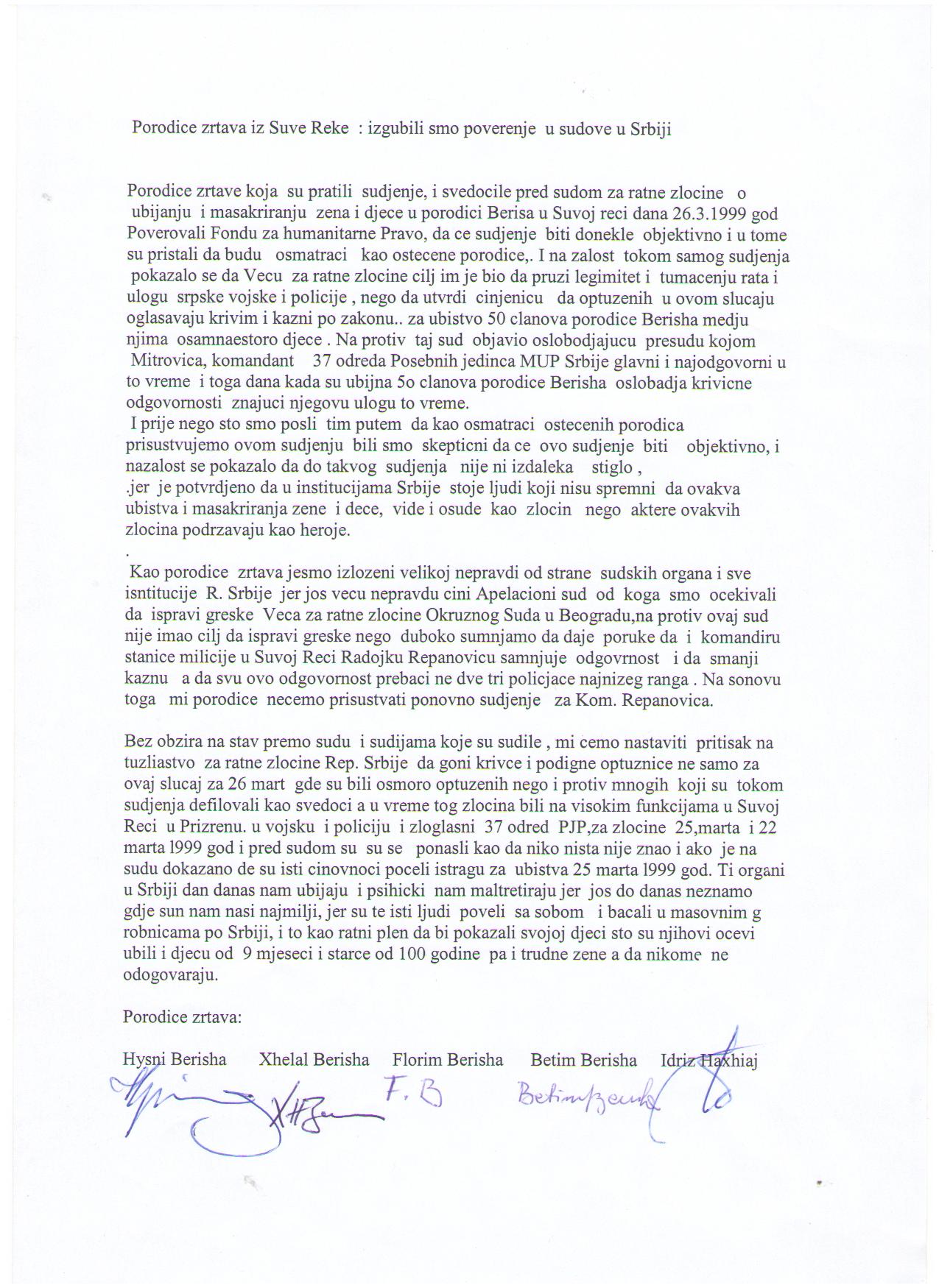 Predstavnici porodica Bersiha koje su pratile suđenje i svedočile pred Većem za ratne zločine Okružnog suda u Beogradu o ubistvu svojih 49 članova, 26. marta 1999. godine u Suvoj Reci, smatraju da Veće za ratne zločine i Apelacioni sud u Beogradu, svojim presudama, štite komandanta 37 Odreda Posebnih jedinica policije Radoslava Mitrovića, koji je počinio ubistva širom Kosova. Porodice Berisha neće prisustvovati ponovljenom suđenju bivšem komandiru policijske stanice u Suvoj Reci, Radojku Repanoviću.